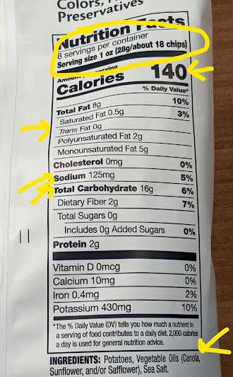 There are a total of 8 servings per entire bag. This means, if I ate the entire bag, I ate 1120 calories in potato chips (140 x 8 = 1120).
